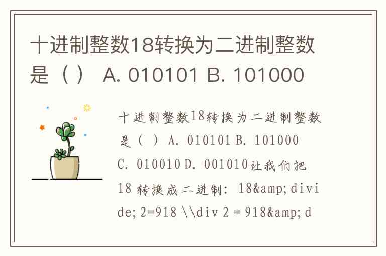十进制整数18转换为二进制整数是( ) A. 010101 B. 101000 C. 010010 D. 001010