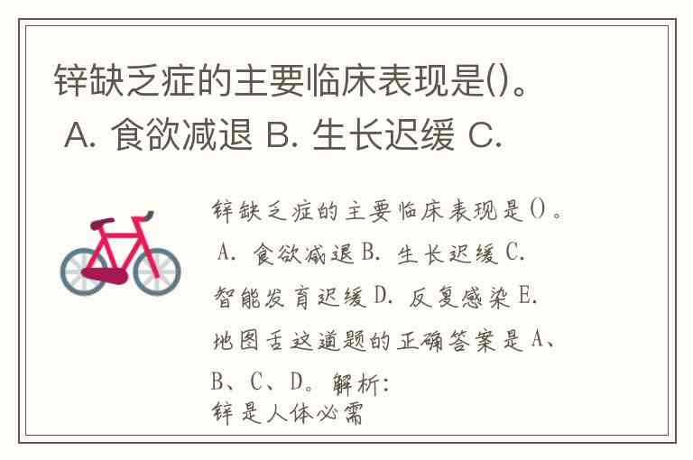 A. 食欲减退:缺锌会导致味蕾功能下降,出现味觉敏感度降低、厌食、异食癖(喜欢吃泥土、墙皮等)等现象。这是最常见的早期表现。
