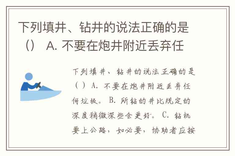 下列填井、钻井的说法正确的是() A. 不要在炮井附近丢弃任何垃圾。 B. 所钻的井比规定的深度稍微深些会更好。 C. 钻机要上公路,如必要,协助者应按有关操作规定,阻断交通确保其安全性。 D. 填井时可以用钻井出来的土或用其它可用材料,但是要避免装填过快。