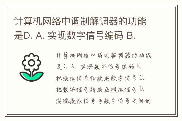 计算机网络中调制解调器的功能是D. A. 实现数字信号编码 B. 把模拟信号转换成数字信号 C. 把数字信号转换成模拟信号 D. 实现模拟信号与数字信号之间的相互转告