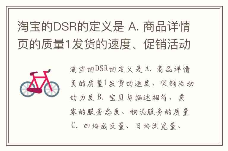 淘宝的DSR的定义是 A. 商品详情页的质量1发货的速度、促销活动的力度 B. 宝贝与描述相符、卖家的服务态度、物流服务的质量 C. 曰均成交量、日均浏览量、日均客服咨询量 D. 月均店铺转化率、月均店铺浏览量、月均成交量