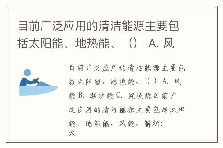目前广泛应用的清洁能源主要包括太阳能、地热能、() A. 风能 B. 潮汐能 C. 波浪能