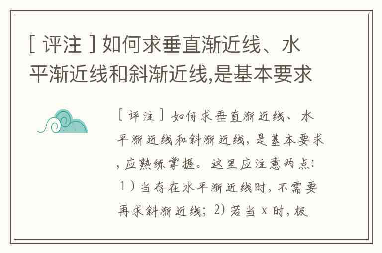 如何求垂直渐近线、水平渐近线和斜渐近线,是基本要求,应熟练掌握。这里应注意两点: