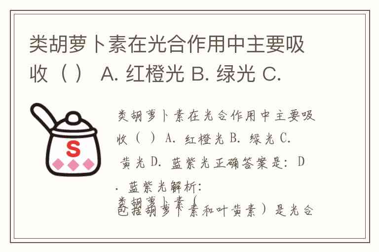 类胡萝卜素在光合作用中主要吸收( ) A. 红橙光 B. 绿光 C. 黄光 D. 蓝紫光