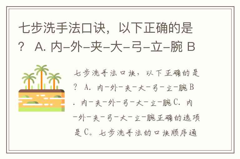 七步洗手法口诀,以下正确的是? A. 内-外-夹-大-弓-立-腕 B. 内-夹-外-弓-大-立-腕 C. 内-外-夹-弓-大-立-腕
