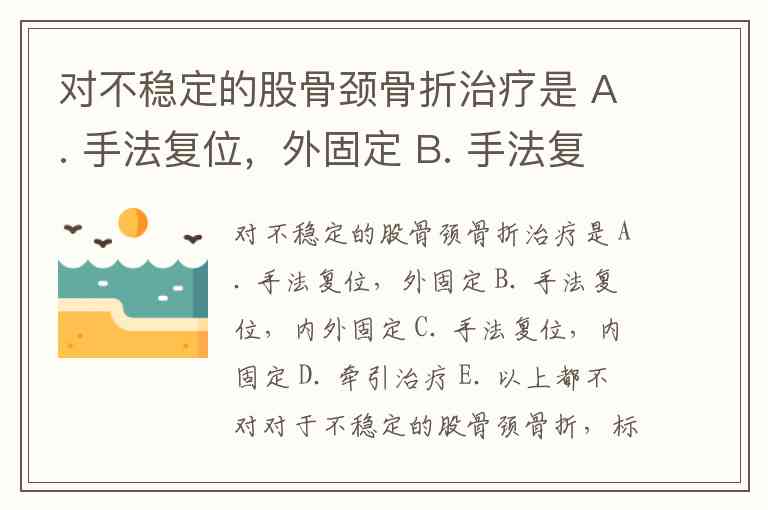 对不稳定的股骨颈骨折治疗是 A. 手法复位,外固定 B. 手法复位,内外固定 C. 手法复位,内固定 D. 牵引治疗 E. 以上都不对