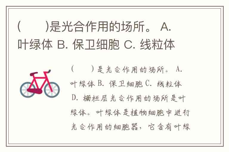 ( )是光合作用的场所。 A. 叶绿体 B. 保卫细胞 C. 线粒体 D. 栅栏层