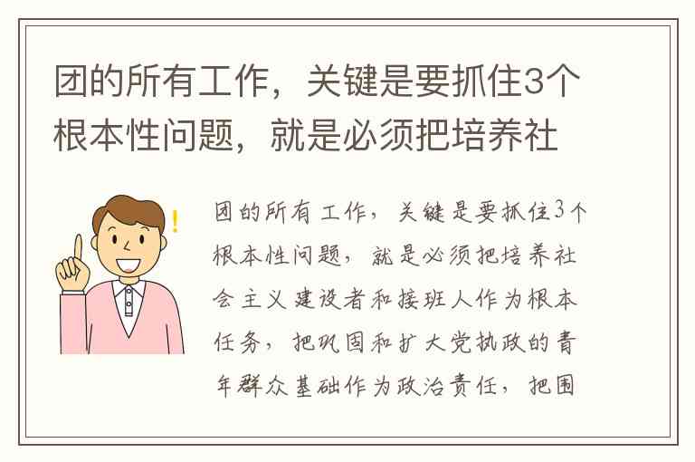 团的所有工作,关键是要抓住3个根本性问题,就是必须把培养社会主义建设者和接班人作为根本任务,把巩固和扩大党执政的青年群众基础作为政治责任,把围绕中心、服务大局作为________。 A. 工作落实 B. 工作使命 C. 政治工作 D. 工作主线