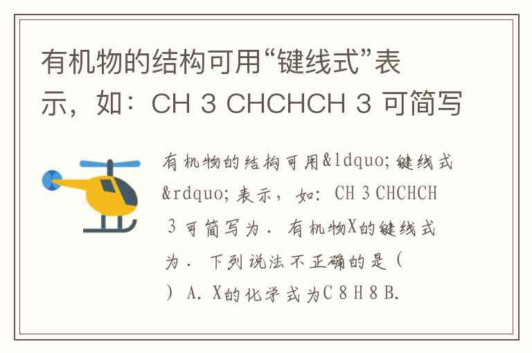 有机物的结构可用“键线式”表示,如:CH 3 CHCHCH 3 可简写为 .有机物X的键线式为 .下列说法不正确的是( ) A. X的化学式为C 8 H 8 B. X能使高锰酸钾酸性溶液褪色 C. 有机物Y是X的同分异构体,且属于芳香烃,则Y的结构简式为 D. X与足量的H 2 在一定条件下反应可生成环状的饱和烃Z,Z的一氯代物有4种