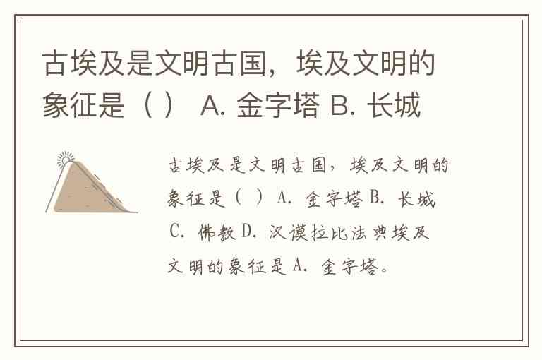 古埃及是文明古国,埃及文明的象征是( ) A. 金字塔 B. 长城 C. 佛教 D. 汉谟拉比法典