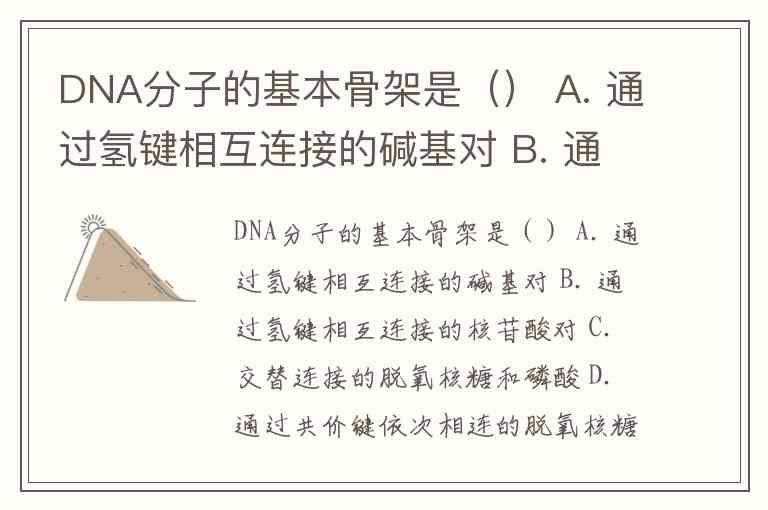 DNA分子的基本骨架是() A. 通过氢键相互连接的碱基对 B. 通过氢键相互连接的核苷酸对 C. 交替连接的脱氧核糖和磷酸 D. 通过共价键依次相连的脱氧核糖和碱基