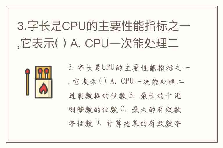 3.字长是CPU的主要性能指标之一,它表示( ) A. CPU一次能处理二进制数据的位数 B. 最长的十进制整数的位数 C. 最大的有效数字位数 D. 计算结果的有效数字长度