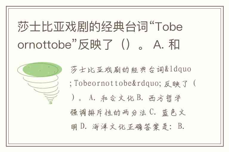 莎士比亚戏剧的经典台词“Tobeornottobe”反映了()。 A. 和合文化 B. 西方哲学强调排斥性的两分法 C. 蓝色文明 D. 海洋文化