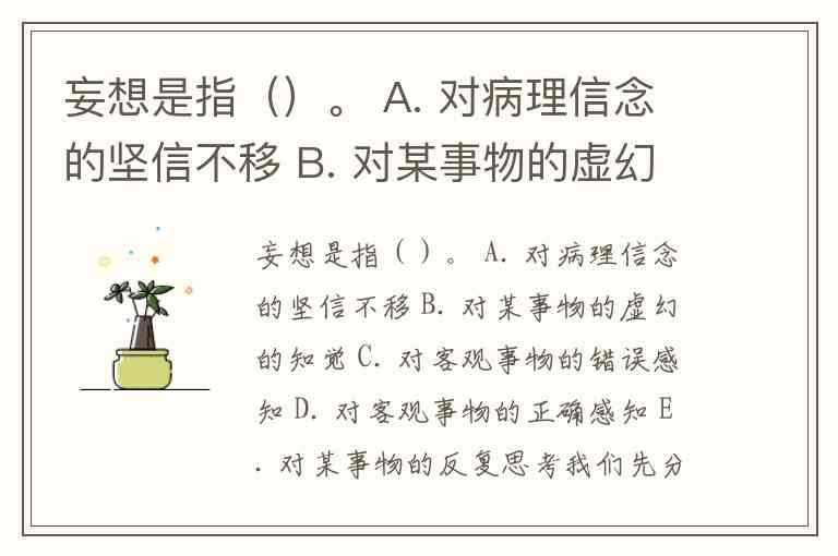 妄想是指()。 A. 对病理信念的坚信不移 B. 对某事物的虚幻的知觉 C. 对客观事物的错误感知 D. 对客观事物的正确感知 E. 对某事物的反复思考