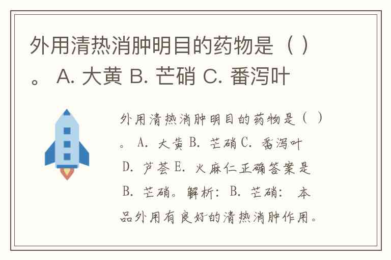 外用清热消肿明目的药物是( )。 A. 大黄 B. 芒硝 C. 番泻叶 D. 芦荟 E. 火麻仁