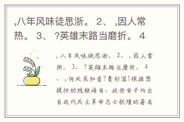 ,八年风味徒思浙。 2、 ,因人常热。 3、 ?英雄末路当磨折。 4、 ,何处觅知音?青衫湿!
