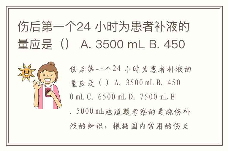 伤后第一个24 小时为患者补液的量应是() A. 3500 mL B. 4500 mL C. 6500 mL D. 7500 mL E. 5000 mL