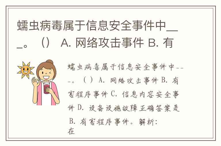 蠕虫病毒属于信息安全事件中___。() A. 网络攻击事件 B. 有害程序事件 C. 信息内容安全事件 D. 设备设施故障