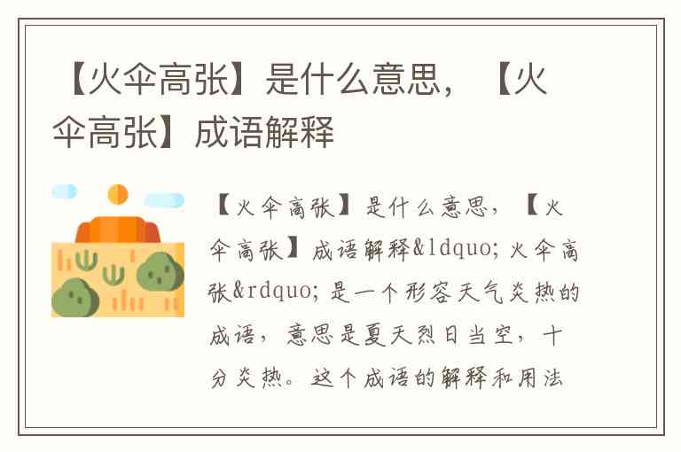 成语解释:火伞,比喻夏天酷热的太阳 -1-2;张,展开。整个成语的字面意思是“火红的伞高高张开”,用来形象地描述烈日当空的景象。