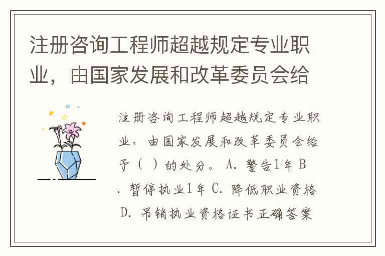 注册咨询工程师超越规定专业职业,由国家发展和改革委员会给予( )的处分。 A. 警告1年 B. 暂停执业1年 C. 降低职业资格 D. 吊销执业资格证书