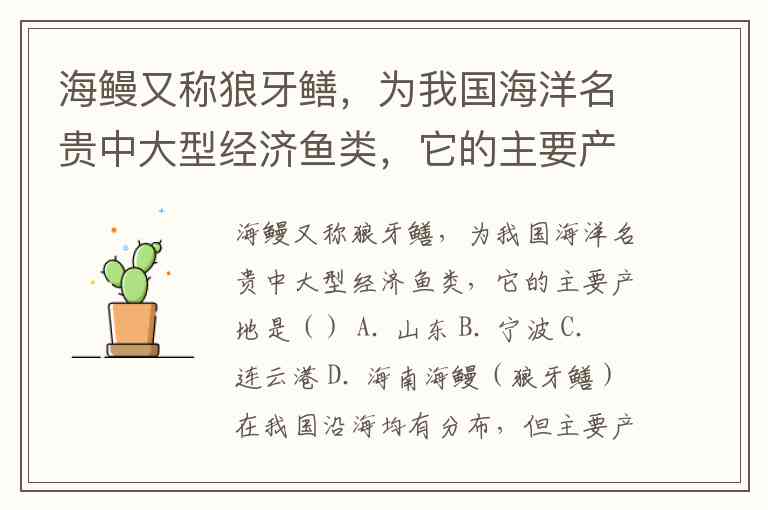 海鳗又称狼牙鳝,为我国海洋名贵中大型经济鱼类,它的主要产地是() A. 山东 B. 宁波 C. 连云港 D. 海南