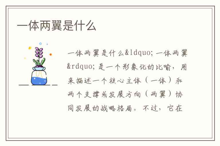 “一体两翼”是一个形象化的比喻,用来描述一个核心主体(一体)和两个支撑或发展方向(两翼)协同发展的战略格局。不过,它在不同的领域和时期,具体所指的内容也完全不同。
