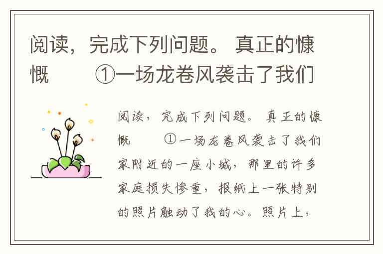 阅读,完成下列问题。 真正的慷慨 ①一场龙卷风袭击了我们家附近的一座小城,那里的许多家庭损失惨重,报纸上一张特别的照片触动了我的心。照片上,一个年轻的女人站在一座完全被毁坏的房屋前面,一个七八岁的小男孩低垂着眼站在她的身边,旁边还有一个小女孩用手抓着妈妈的裙裾,眼睛盯着镜头,目光里充满了慌乱和恐惧。在相关的文章中,作者给出了照片上每个人的衣服尺寸。我注意到他们衣服的尺寸与我和孩子衣服的尺寸很接近。这是教育我的孩子帮助那些比他们不幸的人的好机会。 ②我将照片贴在冰箱上,把他们的困境向我的一对7岁的双胞胎儿子——布兰德和布雷特以及3岁的小女儿梅格安作了解释:“我们有这么多东西,这些可怜的人现在也没有。我们应该把我们的东西和他们分享。”我从阁楼上拿下3只大盒子放在地板上。当男孩子们和我一起把一些罐装食品和其他一些不易腐坏的食物、肥皂等装进其中一只大盒子的时候,梅格安怀里抱着鲁西——她爱极的布娃娃来到我们面前。她紧紧地将它搂在胸前,把她圆圆的小脸贴在鲁西扁平的、被涂上颜色的脸上,给了它最后一个吻,然后,将它轻轻地放在其他玩具的上面。“噢,亲爱的,”我说,“你不必把鲁西捐出来,你是那么喜欢它。” ③梅格安严肃地点了点头,眼睛里闪烁着被她强忍着没有流出来的眼泪:“鲁西给我带来了快乐,妈妈。也许,他会给那个小女孩带去快乐的。” ④我突然意识到,任何一个人都可以把自己不要的东西捐赠给别人,而真正的?慷慨却是把自己最珍爱的东西给予别人。诚挚的仁爱,是一个3岁的孩子希望把一个虽然破旧却是她最珍爱的布娃娃送给那个小女孩的行为。而我,本来是想教育孩子的,结果却从孩子那儿受到了教育。 ⑤男孩子们惊讶地张大了嘴巴。布兰德什么也没说,走进房间拿着他最喜欢的圣斗士出来了。他稍稍犹豫了一下,看了看梅格安,把它放在鲁西的旁边。布雷特的脸上露出了温和的微笑,眼睛里闪着光,跑回房间拿来了他的宝贝火柴盒汽车,郑重地放到盒子里。 ⑥我把我的那件袖口已经磨损得非常厉害的棕褐色夹克衫从那个放着衣服的盒子里拿出来,然后把上个星期刚买的一件绿色的夹克衫放了进去。我希望照片上那个年轻女人会像我一样喜欢它。 1.通读全文,说说文题“真正的慷慨”的含义。_________________________________________________2.文中哪些事件体现了人物“真正的慷慨”?试举例说明。_________________________________________________3.联系文中每个人物在捐出自己东西时的表情、动作和语言,选择一人举例分析其内在的思想感情。_________________________________________________4.从下面(1)、(2)两个题目中任选一题作答,揣摩人物的心理。(1)第⑤段中男孩们之所以“惊讶地张大了嘴巴”,是因为:__________________________________________________(2)第⑥段中“我”之所以将旧夹克衫换 成了新的夹克衫,是因为:___________________________________________________ 5.从文中他们“真正的慷慨”的举动中,你联想到了什么?___________________________________________________