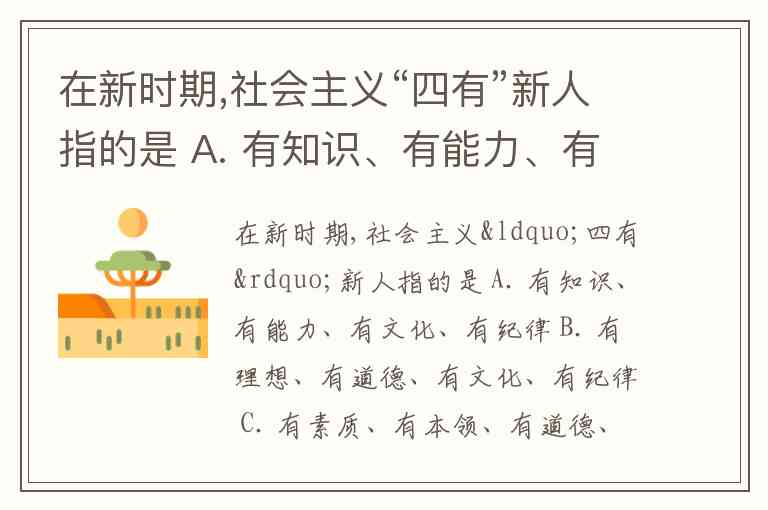 在新时期,社会主义“四有”新人指的是 A. 有知识、有能力、有文化、有纪律 B. 有理想、有道德、有文化、有纪律 C. 有素质、有本领、有道德、有理想 D. 有理想、有信念、有才华、有纪律