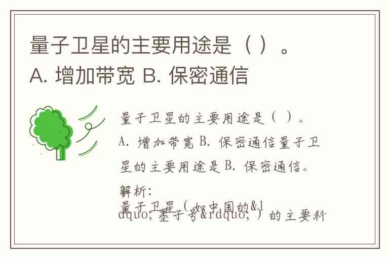 量子卫星的主要用途是( )。 A. 增加带宽 B. 保密通信