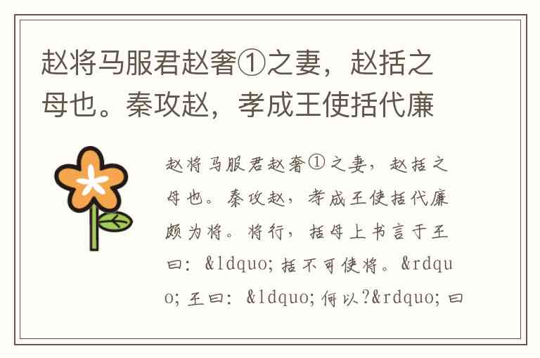 赵将马服君赵奢①之妻,赵括之母也。秦攻赵,孝成王使括代廉颇为将。将行,括母上书言于王曰:“括不可使将。”王曰:“何以?”曰:“始妾事其父,父时为将,身所奉饭者以十数,所友者以百数。大王及宗室所赐币帛,尽以与军吏、士大夫。主命之日,不问家事。今括一旦为将,东向而朝,军吏无敢仰视之者。王所赐金帛,归藏于家。 乃日视便利田宅可买者买之。王以为何如其父乎?父子异心,愿王勿遣。”王曰:“母置之,吾计已决矣。”括母曰:“王终遣之,即有不称, 妾得无随坐乎?”王许诺。括既行,代廉颇。三卜余日,赵兵果败,括死军覆。王以括母先言,故卒不加诛。 【注释】①马服君赵奢:赵奢,战国时赵国的大将。马服君是赵奢的封号。 小题1:下列句加点的词语解释有误的一项是( )(3分) A.父时为将 (做,担任) B.愿王勿遣(派遣) C.始妾事其父(讲故事) D.故卒不加诛(最终) 小题2:下列加点的“将”意思不同于其它三项是( )(3分) A.赵将马服君赵奢之妻 B.父时为将 C.括不可使将 D. 将行,括母上书言于王 小题3:下列对加点的词解释错误的一项是( )(3分) A.父时为将(经常) B.受命之日(那些日子里) C.今括一旦为将(一时) D.乃日视便利田宅可买者(每天) 小题4:翻译画横线的句子。(共6分,每小题3分) (1)乃日视便利田宅可买者 (2)妾得无随坐乎 小题5:用“/”给下列文段断句。(4分) 伯 牙 子 鼓 琴 其 友 钟 子 期 听 之 方 鼓 而 志 在 太 山 钟 子 期 曰 善 哉 乎 鼓 琴 巍 巍 乎 若 太 山 少 选 之 间 而 志 在 流 水 钟 子 期 复 曰 善 哉 乎 鼓 琴 汤 汤 乎 若 流 水!