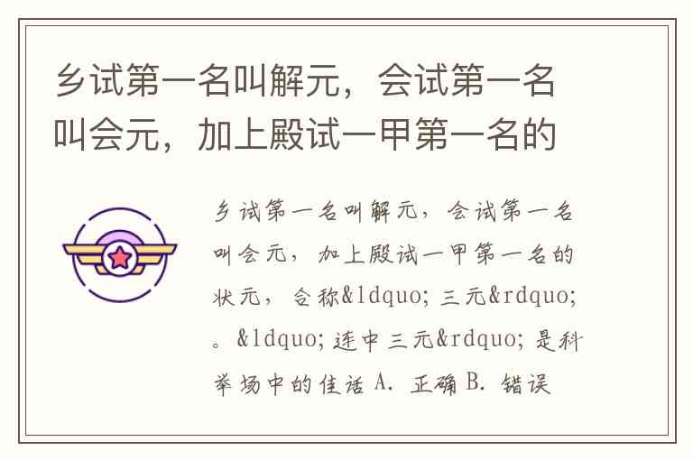 乡试第一名叫解元,会试第一名叫会元,加上殿试一甲第一名的状元,合称“三元”。“连中三元”是科举场中的佳话 A. 正确 B. 错误
