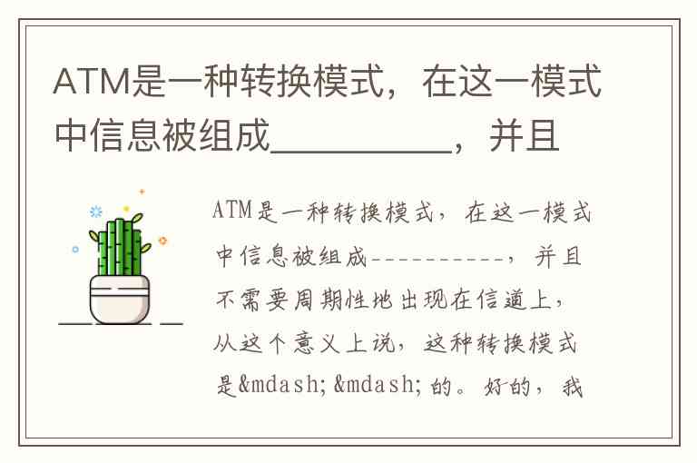 ATM是一种转换模式,在这一模式中信息被组成 信元,并且不需要周期性地出现在信道上,从这个意义上说,这种转换模式是 异步 的。