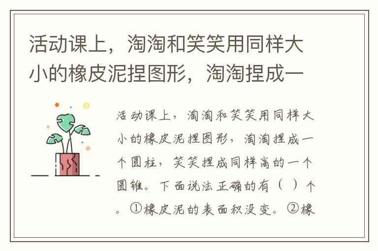 活动课上,淘淘和笑笑用同样大小的橡皮泥捏图形,淘淘捏成一个圆柱,笑笑捏成同样高的一个圆锥。下面说法正确的有( )个。①橡皮泥的表面积没变。②橡皮泥的体积没变。③圆锥的底面积是圆柱底面积的3倍。④圆锥的底面半径是圆柱底面半径的3倍。 A. 3 B. 2 C. 1