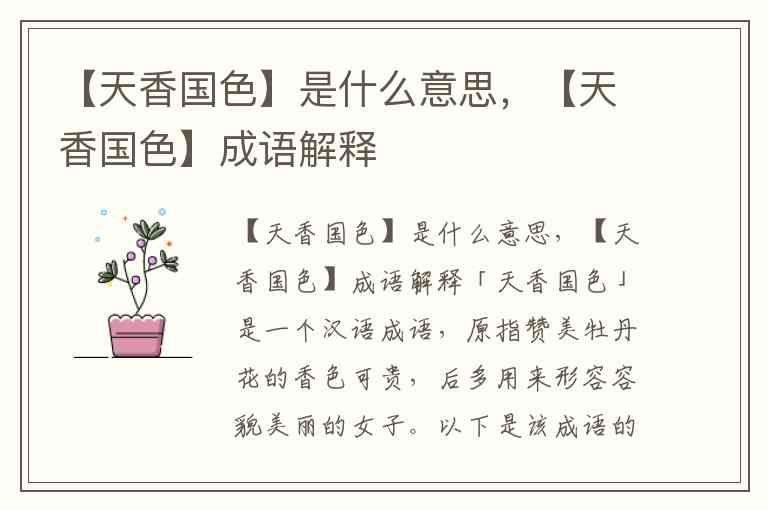 「天香国色」是一个汉语成语,原指赞美牡丹花的香色可贵,后多用来形容容貌美丽的女子。