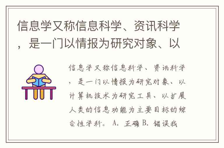 信息学又称信息科学、资讯科学,是一门以情报为研究对象、以计算机技术为研究工具、以扩展人类的信息功能为主要目标的综合性学科。