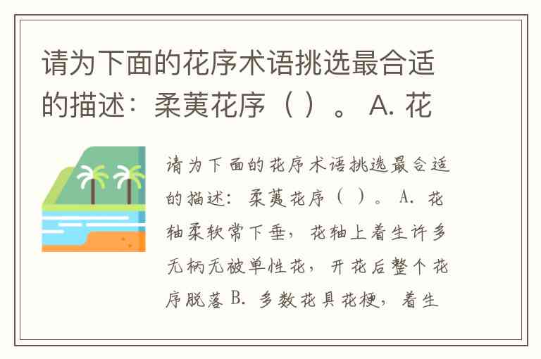 请为下面的花序术语挑选最合适的描述:柔荑花序( )。 A. 花轴柔软常下垂,花轴上着生许多无柄无被单性花,开花后整个花序脱落 B. 多数花具花梗,着生于不分枝的花序轴上 C. 花序轴较长,排列着许多无柄两性花. D. 主 花轴分枝,每个分枝均为总状 花序 ,故 又 称复总状