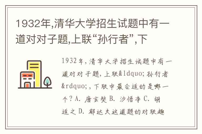 1932年,清华大学招生试题中有一道对对子题,上联“孙行者”,下联中最合适的是哪一个? A. 唐玄奘 B. 沙悟净 C. 胡适之 D. 郁达夫