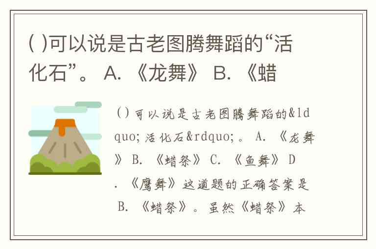 ( )可以说是古老图腾舞蹈的“活化石”。 A. 《龙舞》 B. 《蜡祭》 C. 《鱼舞》 D. 《鹰舞》