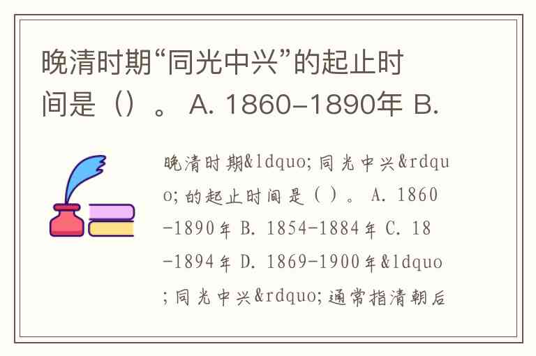 晚清时期“同光中兴”的起止时间是()。 A. 1860-1890年 B. 1854-1884年 C. 18-1894年 D. 1869-1900年