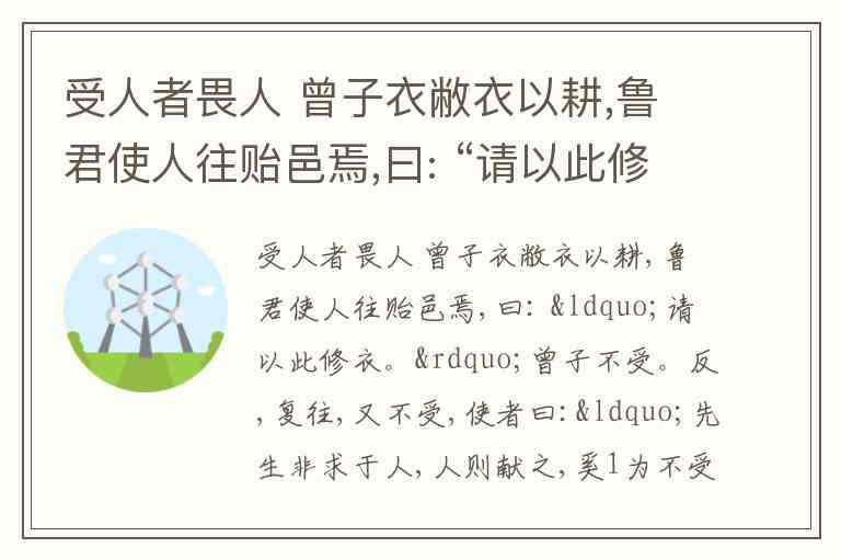 受人者畏人 曾子衣敝衣以耕,鲁君使人往贻邑焉,曰: “请以此修衣。”曾子不受。反,复往,又不受,使者曰:“先生非求于人,人则献之,奚1为不受?”曾子曰:“ 臣闻之,受人者畏人,予人者骄人 。纵君有赐,不我骄也,我能勿畏乎? ”终不受。孔子闻之,曰:“参之言,足以全其节也。”(选自 刘向 《说苑 ·立节》) 【注释】 1 曾子(公元前 505年—公元前435年),名参(音shēn),字 子舆 ,孔子的早期弟子之一 。 2奚:什么,相当于“何”,疑问词。 1.下列句子中加点的词语解释 错误 的一项是( ) A. 鲁君使人往 贻 邑焉 贻:赠送 B. 反 ,复往 反:通“返”,回去 C. 曾子 衣 敝衣以耕 衣:名词活用为动词,穿 D. 足以 全 其节也 全:成全