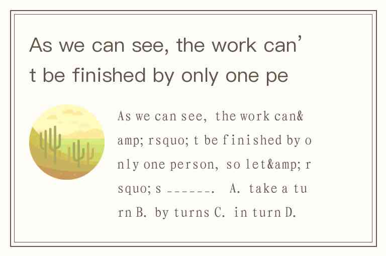 As we can see, the work can’t be finished by only one person, so let’s ______. A. take a turn B. by turns C. in turn D. take turns