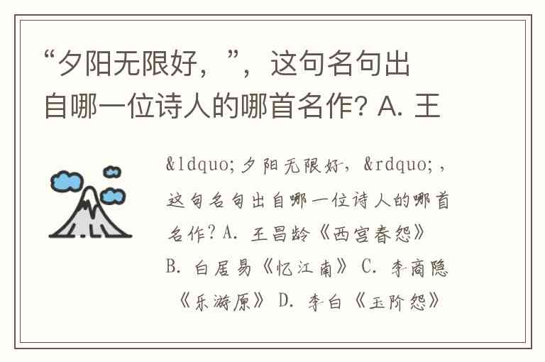 “夕阳无限好,”,这句名句出自哪一位诗人的哪首名作? A. 王昌龄《西宫春怨》 B. 白居易《忆江南》 C. 李商隐 《乐游原》 D. 李白《玉阶怨》
