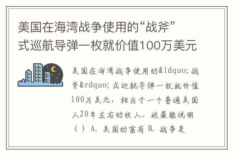 美国在海湾战争使用的“战斧”式巡航导弹一枚就价值100万美元,相当于一个普通美国人20年左右的收人。这最能说明() A. 美国的富有 B. 战争是一种巨大的消耗 C. 美国武器价格昂贵 D. 普通美国人收入低