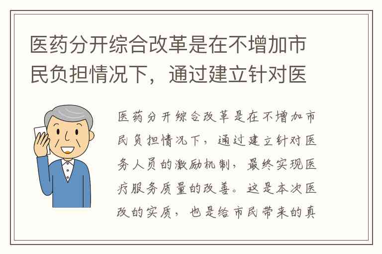 “医药分开综合改革是在不增加市民负担情况下,通过建立针对医务人员的激励机制,最终实现医疗服务质量的改善。这是本次医改的实质,也是给市民带来的真正红利。”