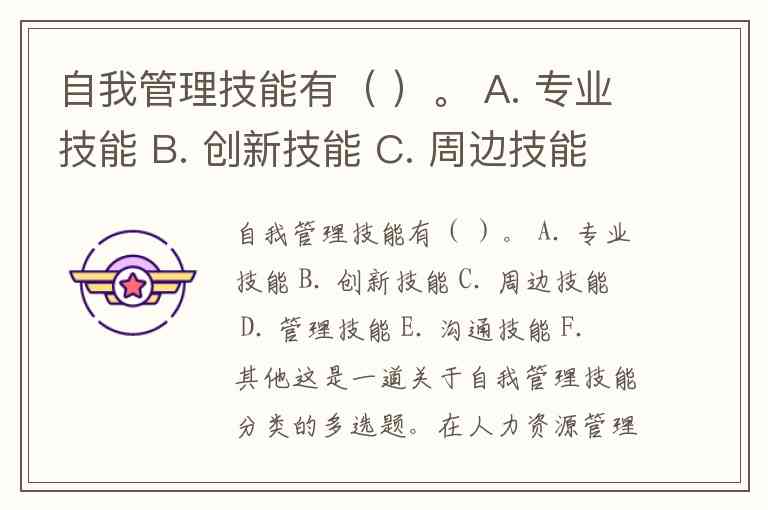 自我管理技能有( )。 A. 专业技能 B. 创新技能 C. 周边技能 D. 管理技能 E. 沟通技能 F. 其他