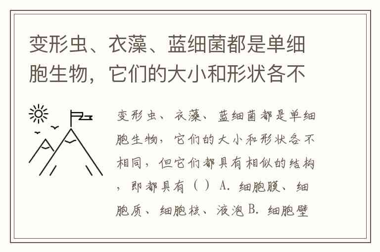 变形虫、衣藻、蓝细菌都是单细胞生物,它们的大小和形状各不相同,但它们都具有相似的结构,即都具有() A. 细胞膜、细胞质、细胞核、液泡 B. 细胞壁、细胞膜、细胞质、细胞核 C. 细胞膜、细胞质、储存遗传物质的场所 D. 细胞膜、细胞质、细胞核、染色体