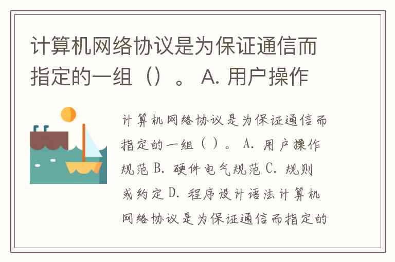 计算机网络协议是为保证通信而指定的一组()。 A. 用户操作规范 B. 硬件电气规范 C. 规则或约定 D. 程序设计语法