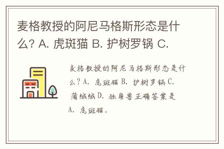 麦格教授的阿尼马格斯形态是什么? A. 虎斑猫 B. 护树罗锅 C. 蒲绒绒 D. 独角兽