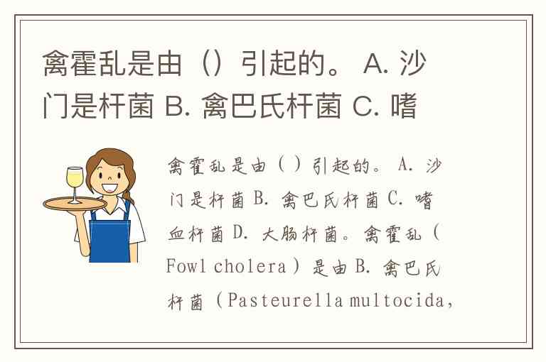 禽霍乱是由()引起的。 A. 沙门是杆菌 B. 禽巴氏杆菌 C. 嗜血杆菌 D. 大肠杆菌。