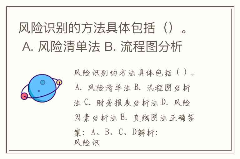风险识别的方法具体包括()。 A. 风险清单法 B. 流程图分析法 C. 财务报表分析法 D. 风险因素分析法 E. 直线图法